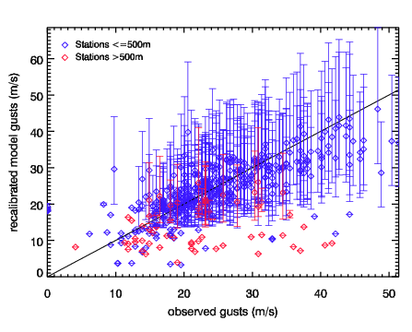 The sections below show: 1) details and statistics; 2) gust speed animation showing the track and instantaneous 3-second gusts at 3 hour intervals over a 72 hour period; 3) storm tracks showing the maximum in relative vorticity and minimum in MSLP, while labels on the maximum relative vorticity path indicate the start of that day; 4) raw footprint is described in Storm footprints; 5) uncontaminated raw footprint only includes gusts local to the storm (as described on Storm footprints); 6) observational footprint from MIDAS database; 7) recalibrated lower 95% bound is described in Recalibration of final storm footprints; 8) recalibrated mean is described in Recalibration of final storm footprints; 9) recalibrated upper 95% bound is described in Recalibration of final storm footprints; 10) raw models gusts versus observed gusts is described in Comparison of model footprints to station data; 11) recalibrated models gusts versus observed gusts showing the 95% bounds as error bars. Where data is available, links are provided under figure.