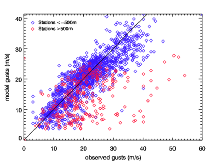 The sections below show: 1) details and statistics; 2) gust speed animation showing the track and instantaneous 3-second gusts at 3 hour intervals over a 72 hour period; 3) storm tracks showing the maximum in relative vorticity and minimum in MSLP, while labels on the maximum relative vorticity path indicate the start of that day; 4) raw footprint is described in Storm footprints; 5) uncontaminated raw footprint only includes gusts local to the storm (as described on Storm footprints); 6) observational footprint from MIDAS database; 7) recalibrated lower 95% bound is described in Recalibration of final storm footprints; 8) recalibrated mean is described in Recalibration of final storm footprints; 9) recalibrated upper 95% bound is described in Recalibration of final storm footprints; 10) raw models gusts versus observed gusts is described in Comparison of model footprints to station data; 11) recalibrated models gusts versus observed gusts showing the 95% bounds as error bars. Where data is available, links are provided under figure.