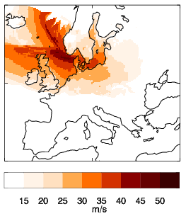 | Maximum 925 hPa wind speed over land from ERA Interim re-analysis (Umax): | 34.85ms-1 | |